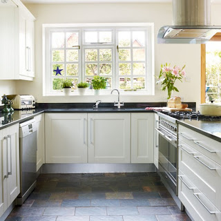 Ez a konyha számomra nagyon közel áll az ideálishoz: szép, fehér bútorok, mosogató az ablak előtt, ebédlőasztal középen, kedvenc metrócsempe a falon. Ami nem az igazi: a fapadló, illetve a belső keringetésű elszívó. 8/10