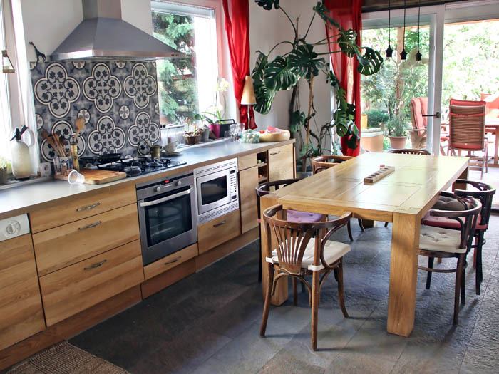 Ez a konyha majdnem tökéletes, bár keveset látunk a bútorból. Gyönyörű és strapabíró a padlóburkolat, viszont a felmosás nem lehet leányálom, mert rücskös, bár legalább nem csúszik vizesen sem. A fali cementlap álomszép, kérdés, hogyan bírja, ha a zsíros lerakódást dörzsöljük róla rendszeresen. Szép a konyhabútor, jól illik hozzá az egyszerű munkalap. Az étkezőasztal és a székek mesések, nemigen tudnék szebbet választani. A tűzhely elhelyezése a két ablak között tökéletes (amit meg lehet oldani természetes módon, ahhoz ne használjunk feltétlenül gépet, mint pl. a szellőztetés.) Amit nem igazán értek, mi az a bokor a sarokban? Nem lett volna jobb oda egy tárolóelem? Abból a konyhában sosem lehet túl sok. 9/10